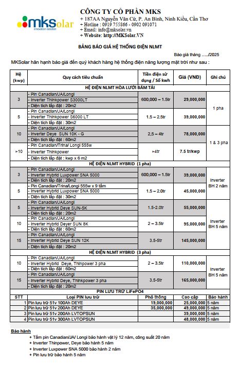 Bảng giá lắp đặt điện năng lượng mặt trời 2025