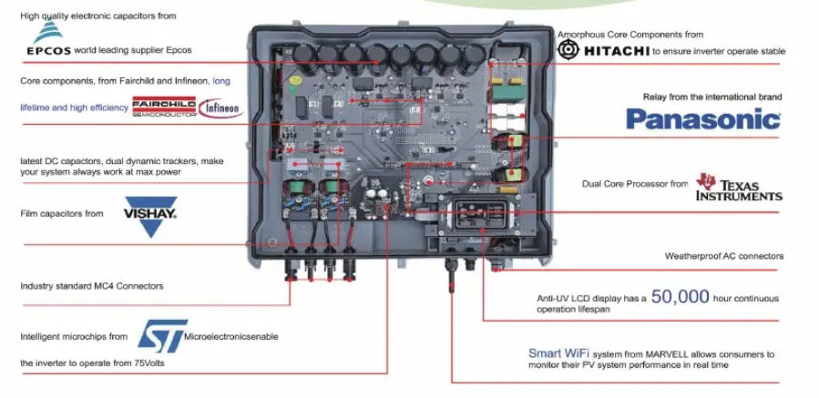 Các linh kiện lắp ráp inverter có xuất xứ từ các hãng nổi tiến trên thế giới như Hitachi, Panasonic, Texas ... nên rất an tâm về độ bền khi sử dụng.