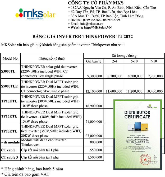 MKSolar xin công bố bảng giá inverter Thinkpower dành cho khách hàng. Giá đặt biệt ưu đãi dành cho các đối tác là anh em thợ, đại lý... Giá được bán dựa vào số lượng mua tích lũy của khách hàng trong tháng.