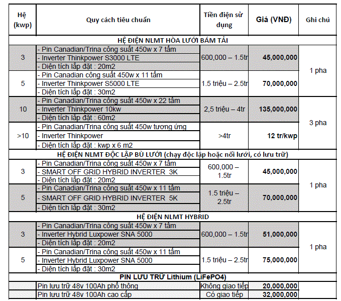 Chi tiết giá lắp đặt trọn gói hệ thống năng lượng mặt trời như sau :