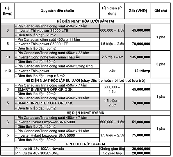 Bảng giá lắp đặt hệ thống điện mặt trời tháng 04/2022