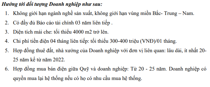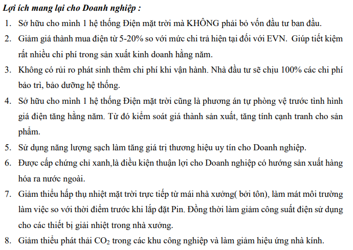 Các quỹ đầu tư sẽ bỏ vốn đầu tư toàn bộ hệ thống điện mặt trời trên mái nhà quý khách hàng. Doanh nghiệp sẽ được thuê hệ thống này hoặc mua lại nguồn điện sạch được sản xuất từ hệ thống với giá ưu đãi hơn giá điện hiện hành từ EVN từ 5-20% so với giá EVN. Khi hợp đồng kết thúc, doanh nghiệp sẽ được chuyển giao miễn phí toàn bộ hệ thống với công suất cam kết trên 80-90% (tùy điều kiện). Lúc này, doanh nghiệp chính thức sở hữu hệ thống điện mặt trời có giá trị lên tới hàng chục tỉ đồng dù trước đó không tốn bất cứ chi phí đầu tư nào.
