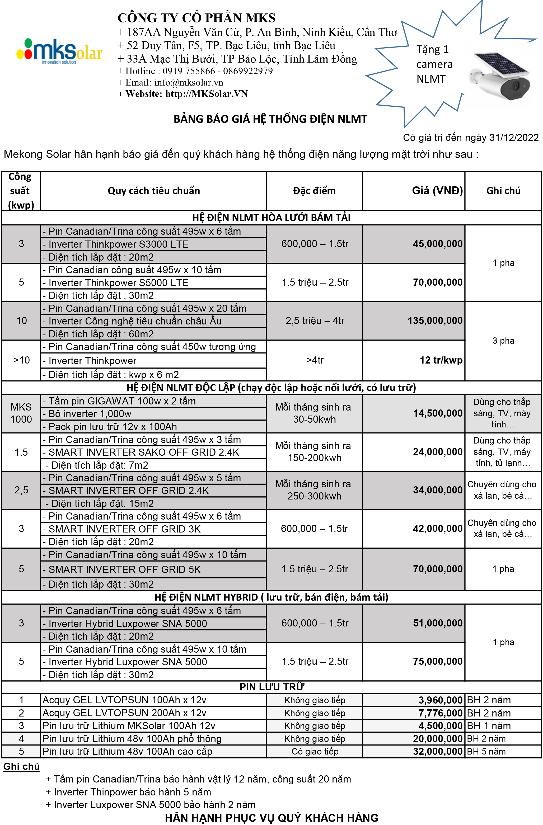 MKSolar xin gởi đến quý khách hàng báo giá trọng gói lắp đặt NLMT tháng 12/2022. Vẫn duy trì chương trình khuyến mãi tặng 1 camera NLMT wifi trị giá lên đến 2,5 triệu đồng.
